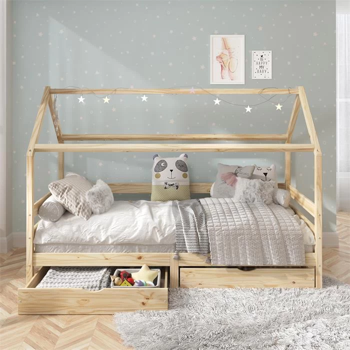 Hausbett CLIA In 90 X 200 Cm Aus Massiver Kiefer Mit 2 Schubalden In Natur