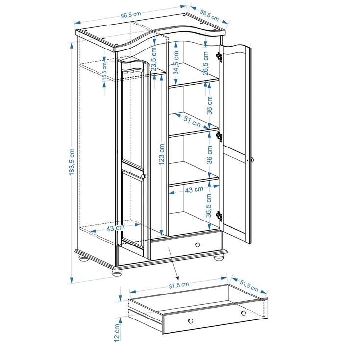 - Aufbaumaß (B/H/T): 96,5 x 183,5 x 57 cm