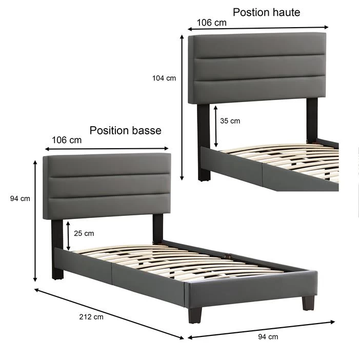 - Kopfteil verstellbar: Mindesthöhe 94 cm, mittlere Höhe 99, maximale Höhe 104 cm