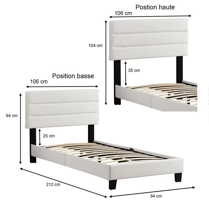 - Kopfteil verstellbar: Mindesthöhe 94 cm, mittlere Höhe 99, maximale Höhe 104 cm