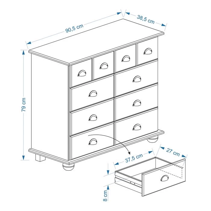 Schubladenschrank COLMAR, Kiefer Massiv, Mit 8 Schubladen