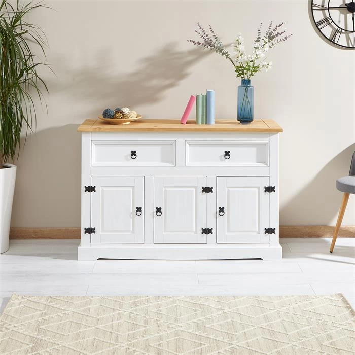 Sideboard TEQUILA, Kiefer Massiv Weiß/braun, Mit 3 Türen Und 2 Schubladen, Mexiko